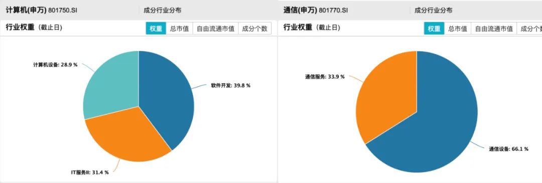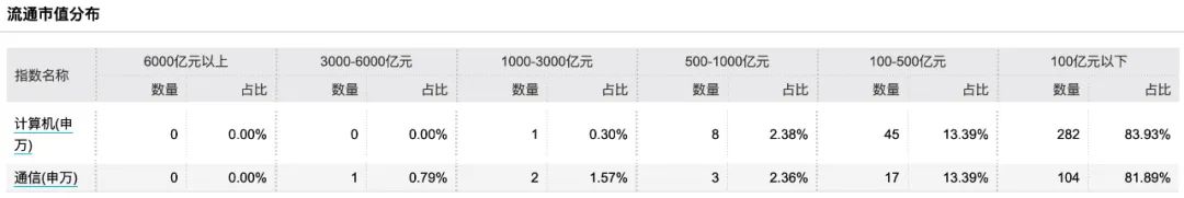 从成分股流通市值来看,计算机和通信都偏向中小市值风格。通信有1只超过3000亿元,有2只超过千亿元,计算机仅1只超过千亿元。百亿元以下占比:计算机为83.93%,通信为81.89%。