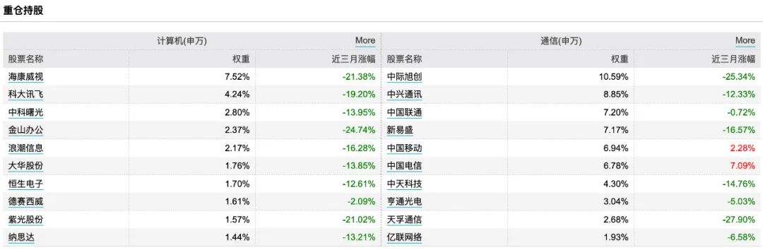 从最近三个月对比表现看,计算机板块表现更差,10只重仓股均下跌,海康威视、金山办公、紫光股份,3只个股跌超20%,6只个股跌超10%;通信板块相对更强,中国移动、中国电信收涨,2只个股跌超20%,3个个股跌超10%。