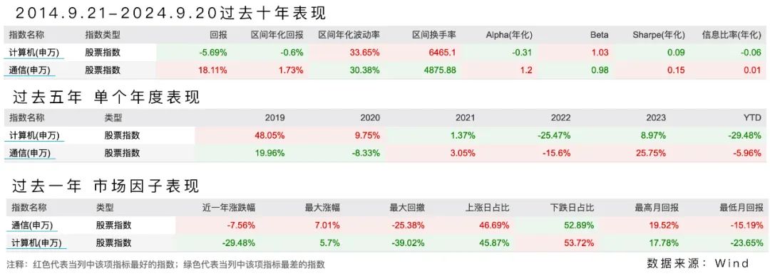 2014.9.21-2024.9.20过去十年区间,计算机累计下跌5.69%,年化回报-0.60%;通信累计上涨18.11%,年化回报1.73%。最近五年,计算机累计下跌37.08%,年化回报-9.11%;通信累计下跌11.41%,年化回报-2.47%。过去5年和10年,通信比计算机累计表现都更强!